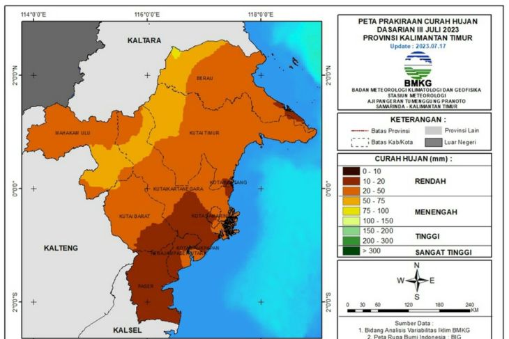 Sementara itu, berdasarkan hasil analisis kejadian dasarian II Juli (11-20 Juli) 2023, wilayah Kaltim umumnya mengalami curah hujan kategori rendah berkisar 0 - 50 mm