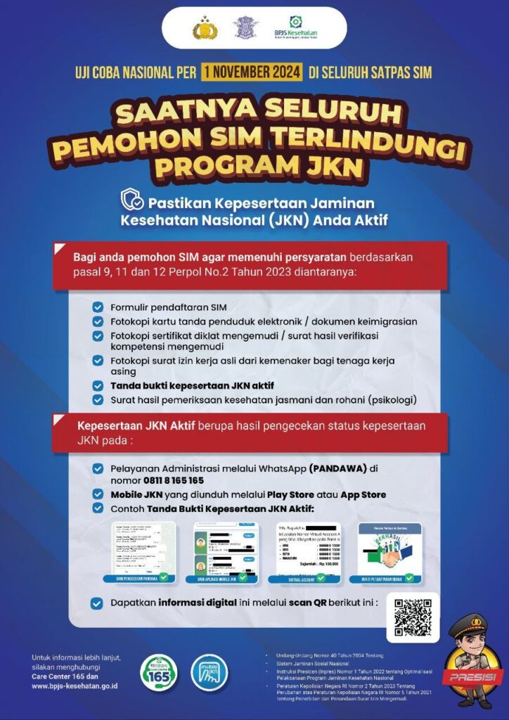 Aturan ini sejalan dengan Peraturan Kepolisian Republik Indonesia Nomor 2 Tahun 2023, yang mengharuskan semua pemohon SIM, baik SIM A, SIM B, maupun SIM C, melampirkan bukti kepesertaan JKN yang aktif. Tujuannya untuk memastikan seluruh pengendara memiliki perlindungan kesehatan yang memadai.