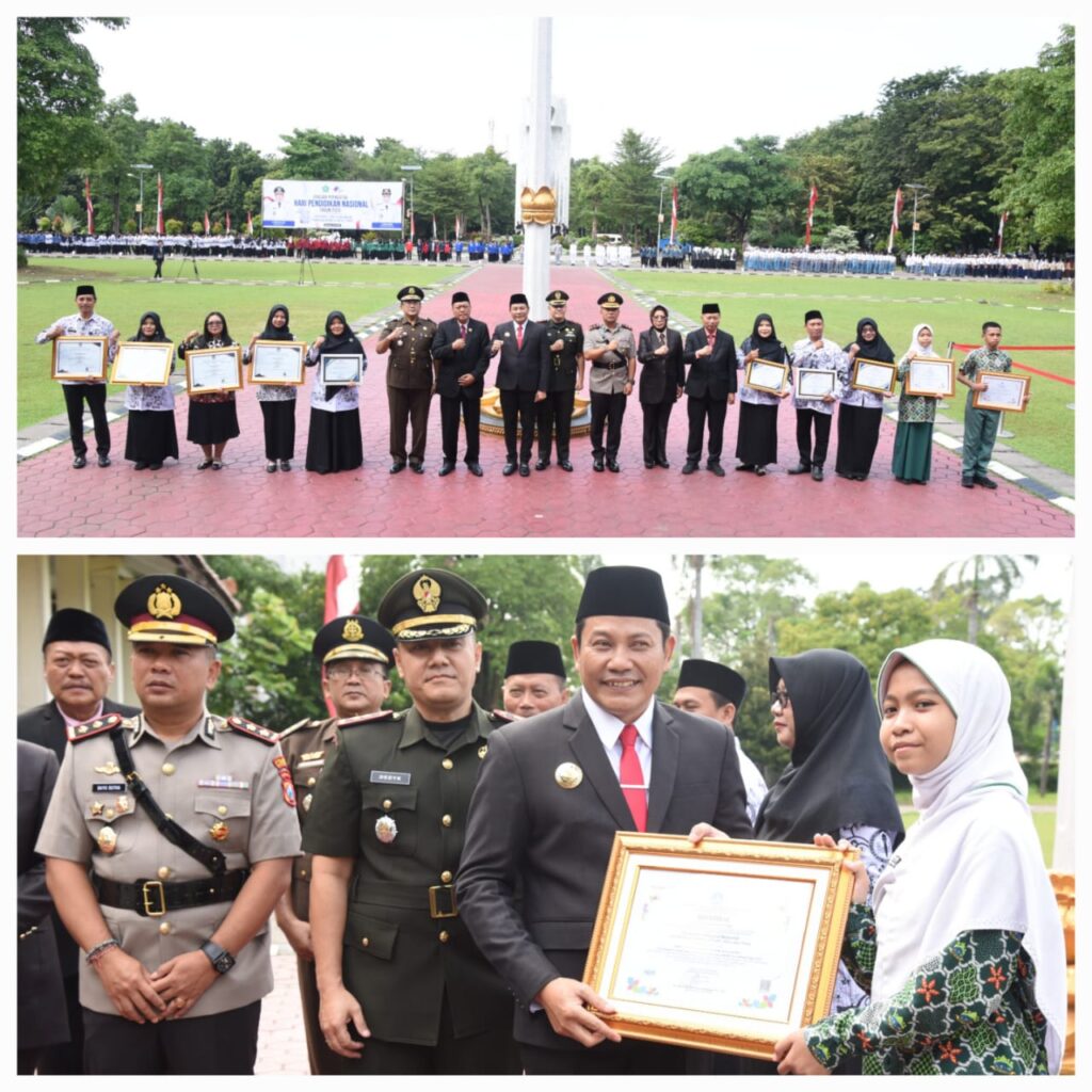 Sidoarjo – Bupati Sidoarjo Subandi menyerahkan berbagai penghargaan kepada guru dan siswa dalam peringatan Hari Pendidikan Nasional, Jumat (2/5/2025).